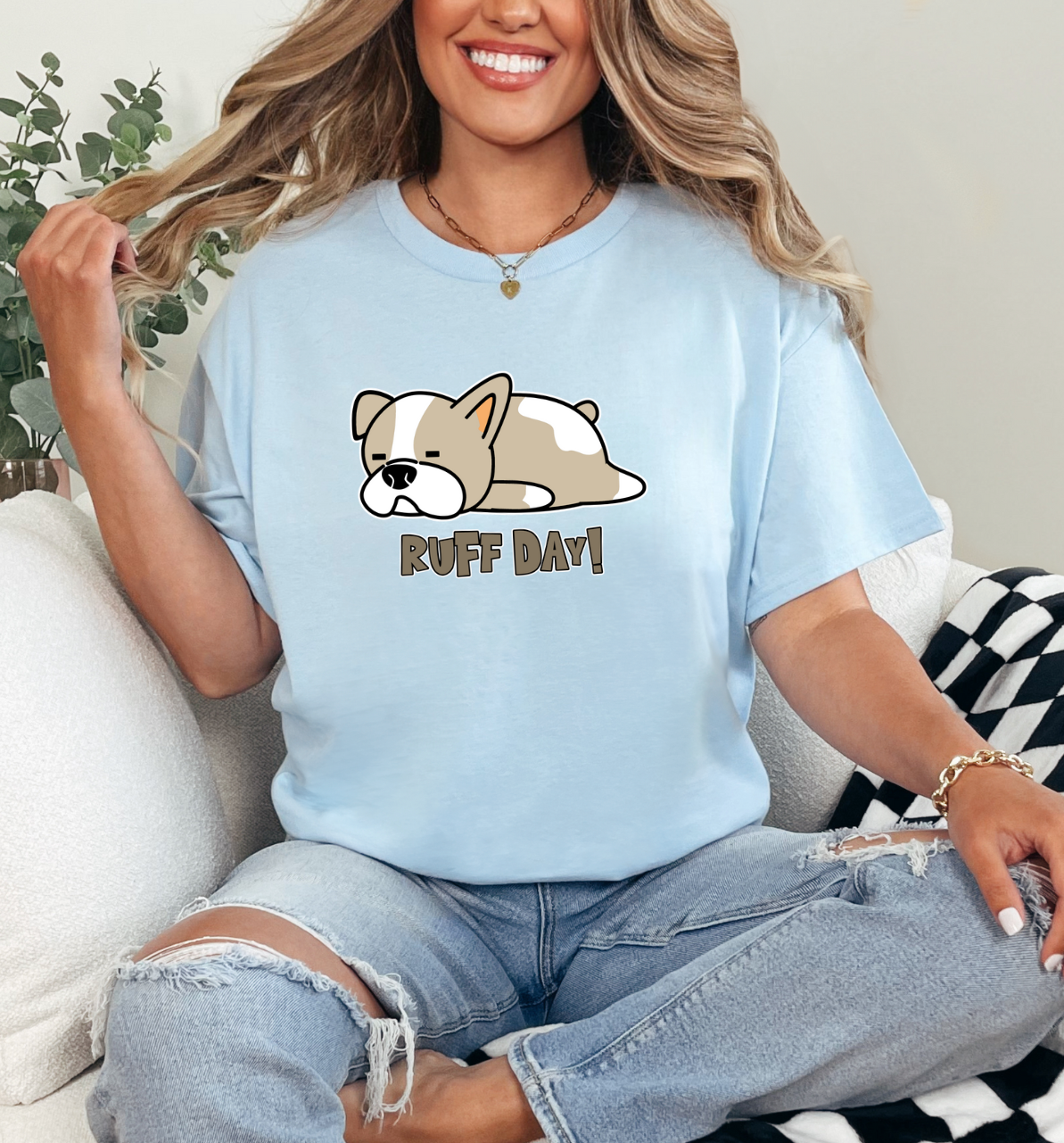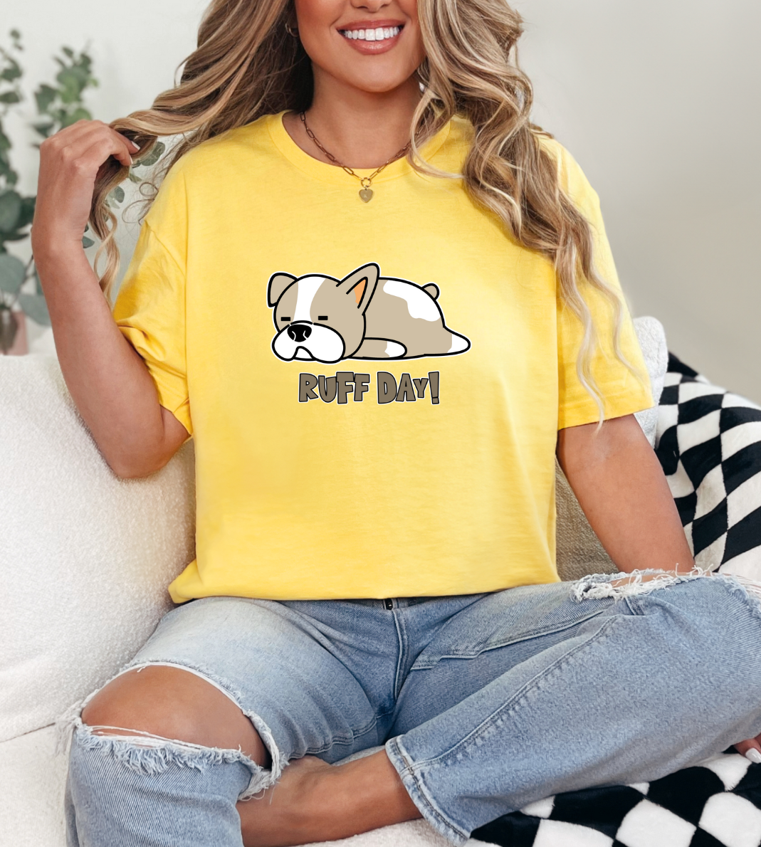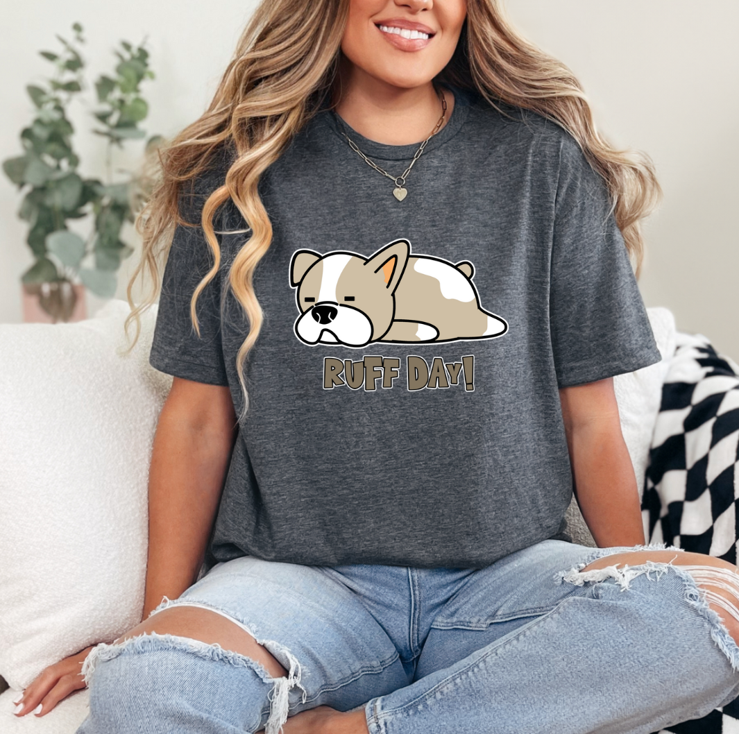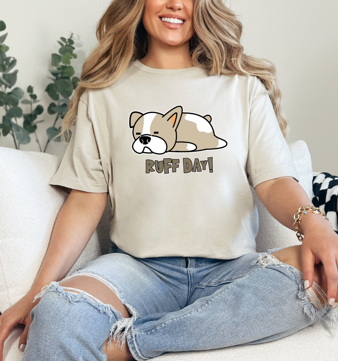 Design: Screen-printed graphic of a sleeping dog with the playful text “Ruff Day!”